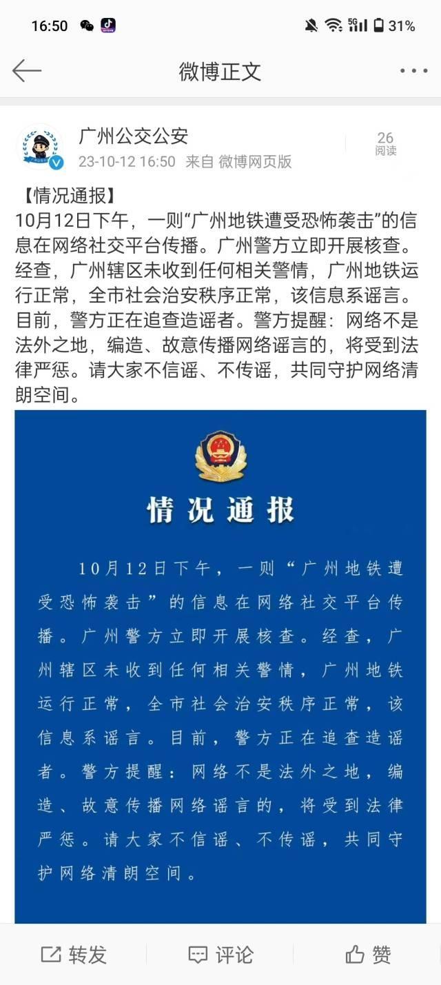 网传著作截图从截图来看,“音信”开始疑似为广州市公安局。当宇宙午,广州公交公安官方微博发布情况通报:10月12日下昼,一则“广州地铁遇到恐怖紧要”的信息在集中酬酢平台传播。广州警方立即开展核查。经查,广州辖区未收到任何干系警情,广州地铁开动普通,全市社会纪律规律普通,该信息系谣喙。当今,警方正在追查责骂者。警方辅导:集中不是法外之地,凭空、特等传播集中谣喙的,将受到法律重办。请众人不信谣、不传谣,共同防守集中晴明空间。